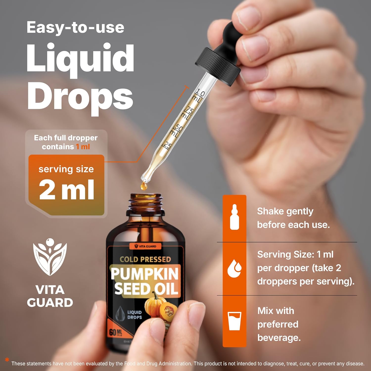 Vita Guard Pumpkin Seed Oil Liquid Drops – 2000 mg Cold-Pressed – Natural Nutritional Support Experience the power of cold-pressed pumpkin seed oil in easy-to-use liquid drops. Each serving delivers 2000 mg of nutrient-rich oil packed with essential fatty acids and plant sterols that support overall wellness, including hair, skin, and hormonal balance. Naturally flavored with a smooth pumpkin taste—no capsules or pills needed. Perfect for men and women seeking clean, vegan, Non-GMO, and gluten-free supplements. Produced in a GMP-certified facility for quality you can trust.