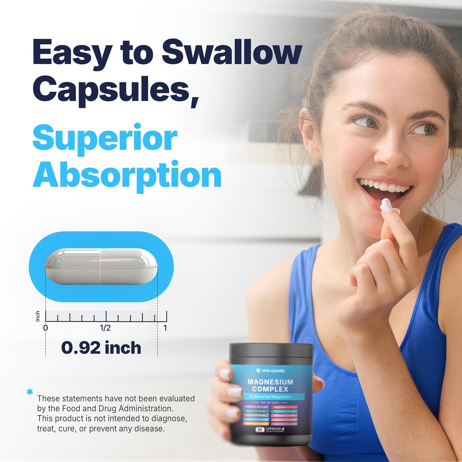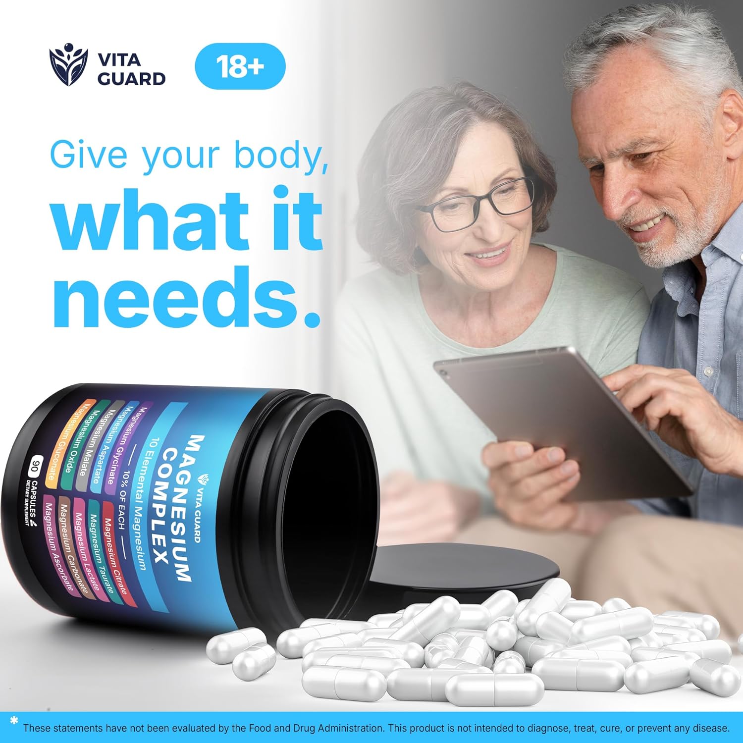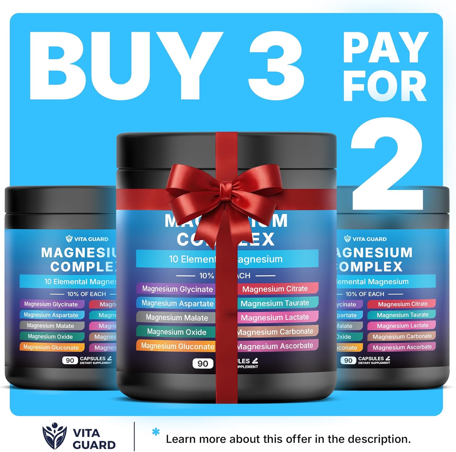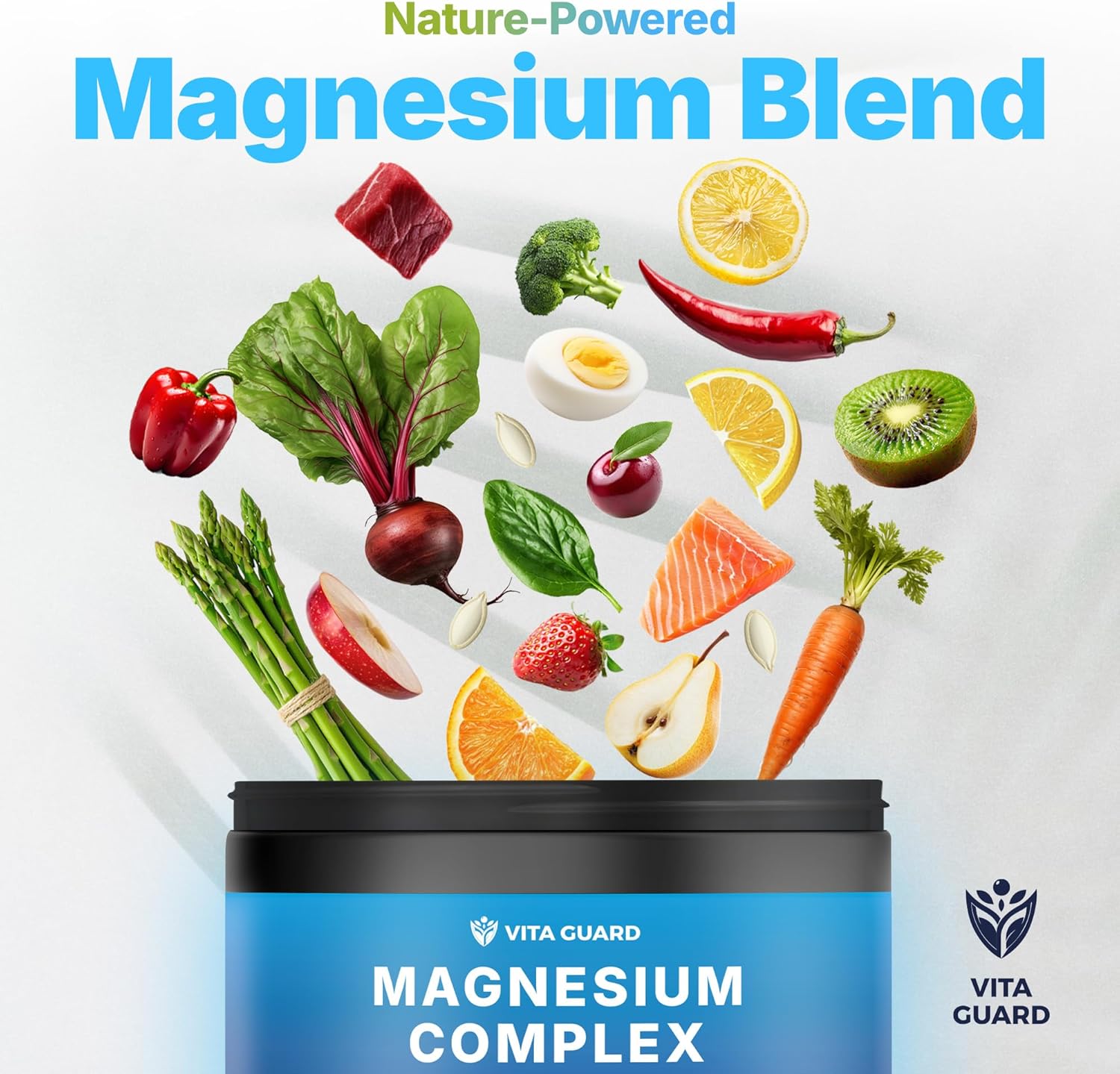 Vita Guard Magnesium Supplement 1480mg delivers 10 forms of highly absorbable magnesium—including Glycinate, Citrate, Malate, and more—to support muscle function, nerve health, energy production, and relaxation. This clean, vegan formula is Non-GMO, gluten-free, and third-party tested for quality. With 45 servings per bottle, it’s an easy daily solution for balanced wellness and vitality.