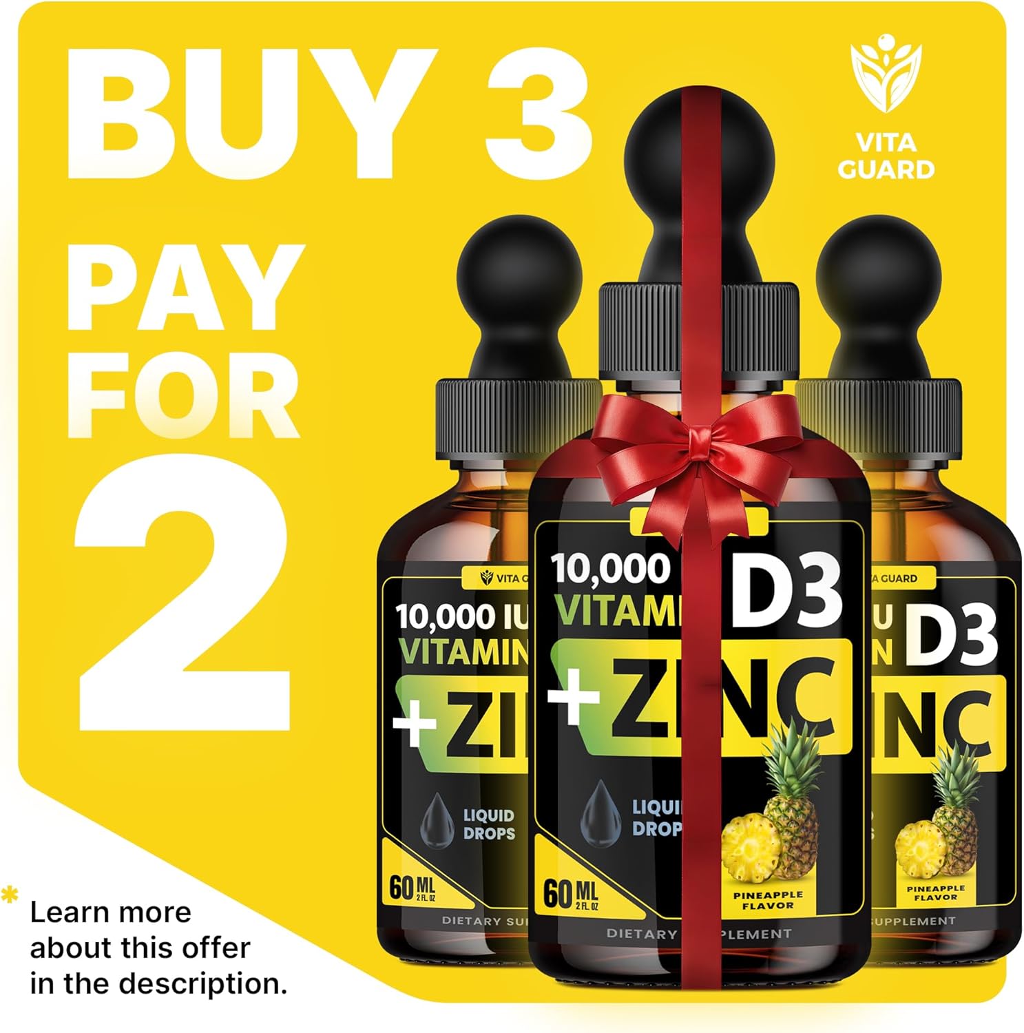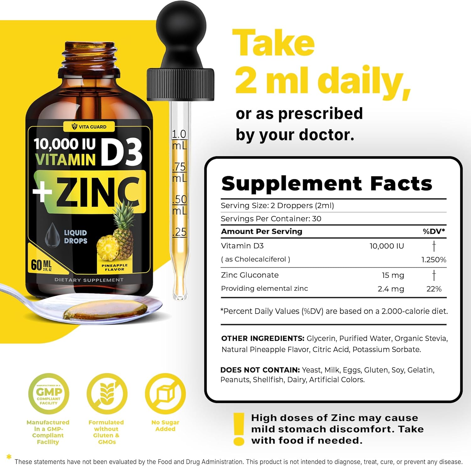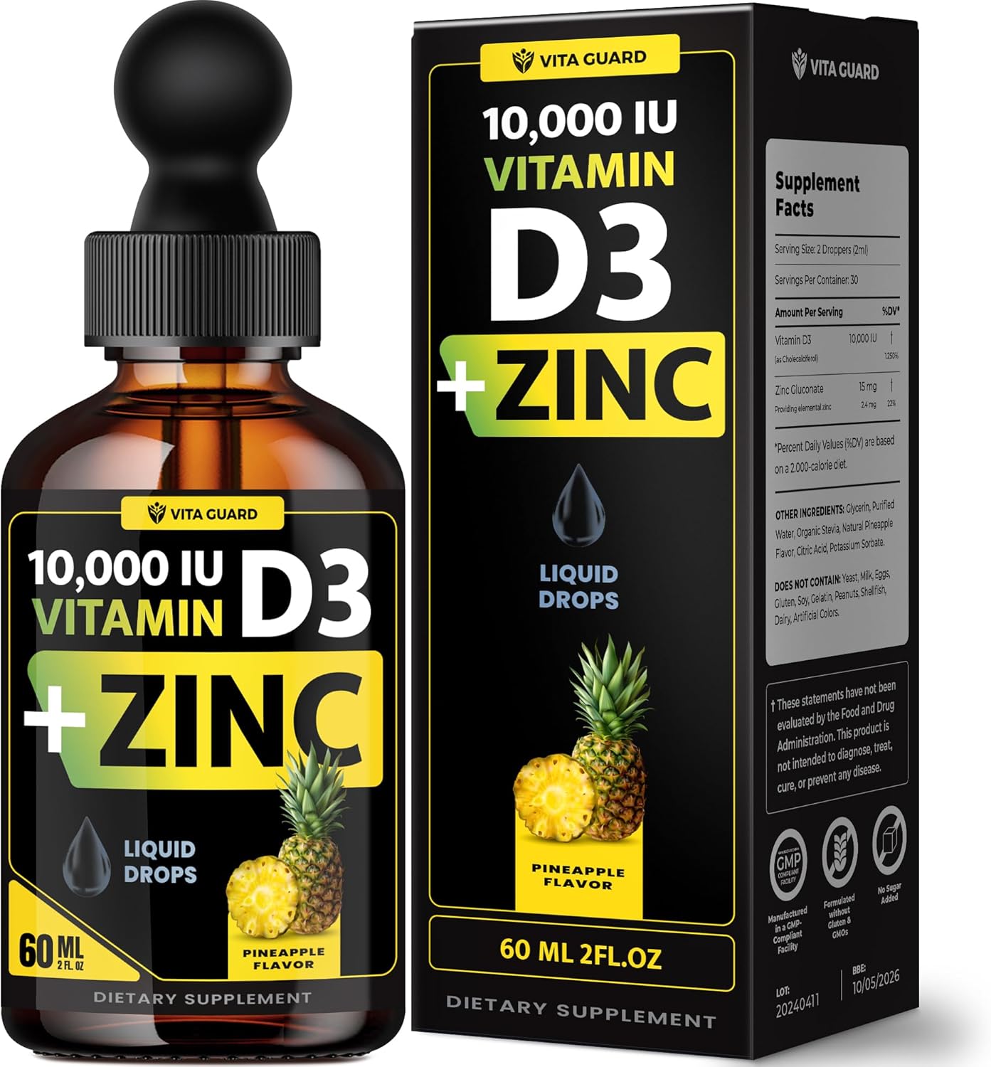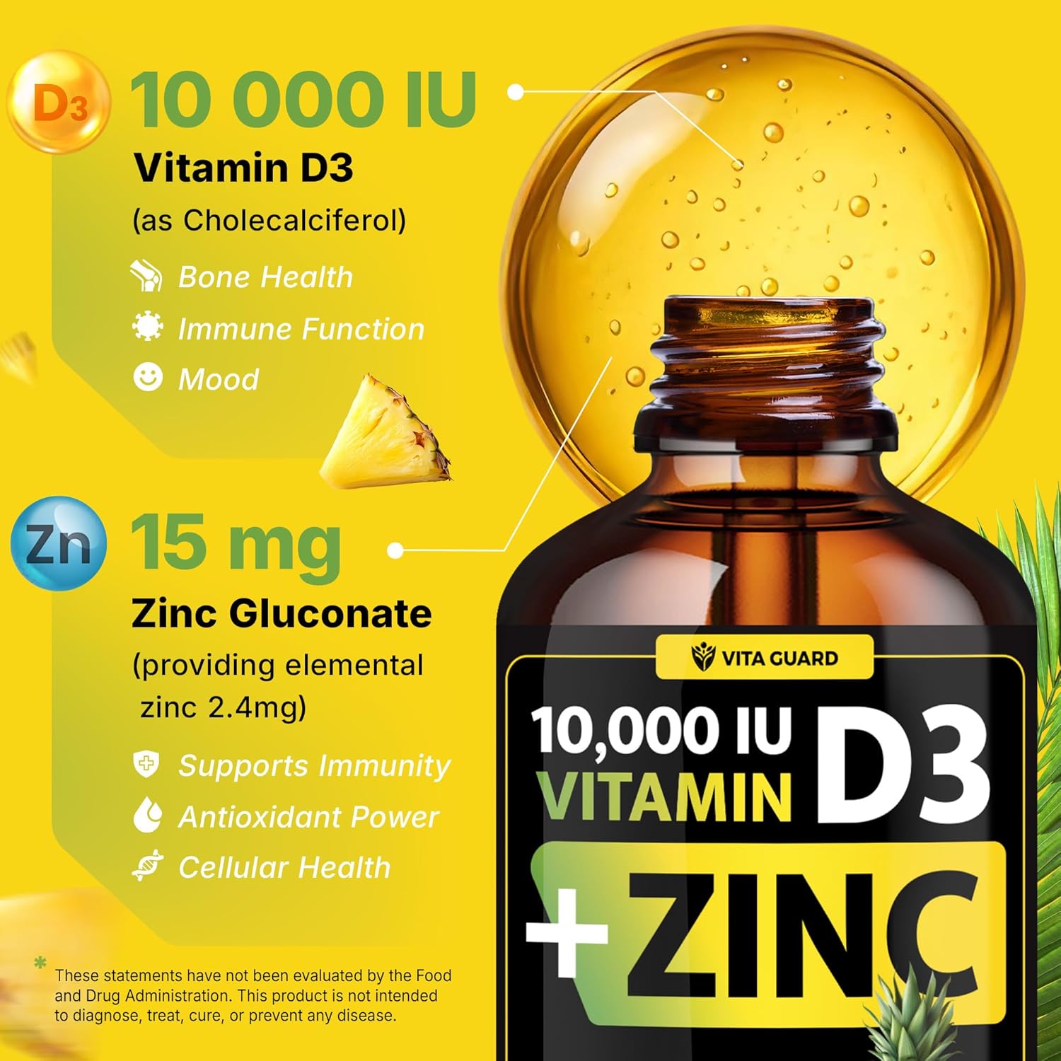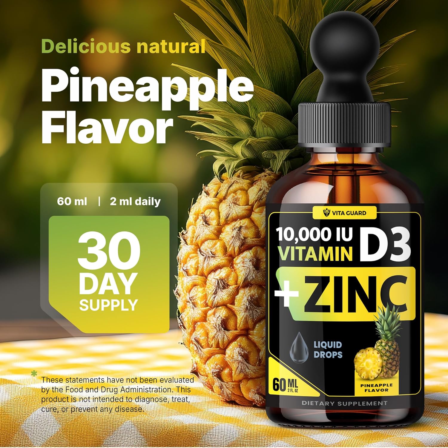 Vitamin D3 Drops with Zinc – 10,000 IU D3 & 15 mg Zinc Liquid Supplement – Immune Support for Men & Women – Sugar-Free Pineapple Flavor – 30-Day Supply